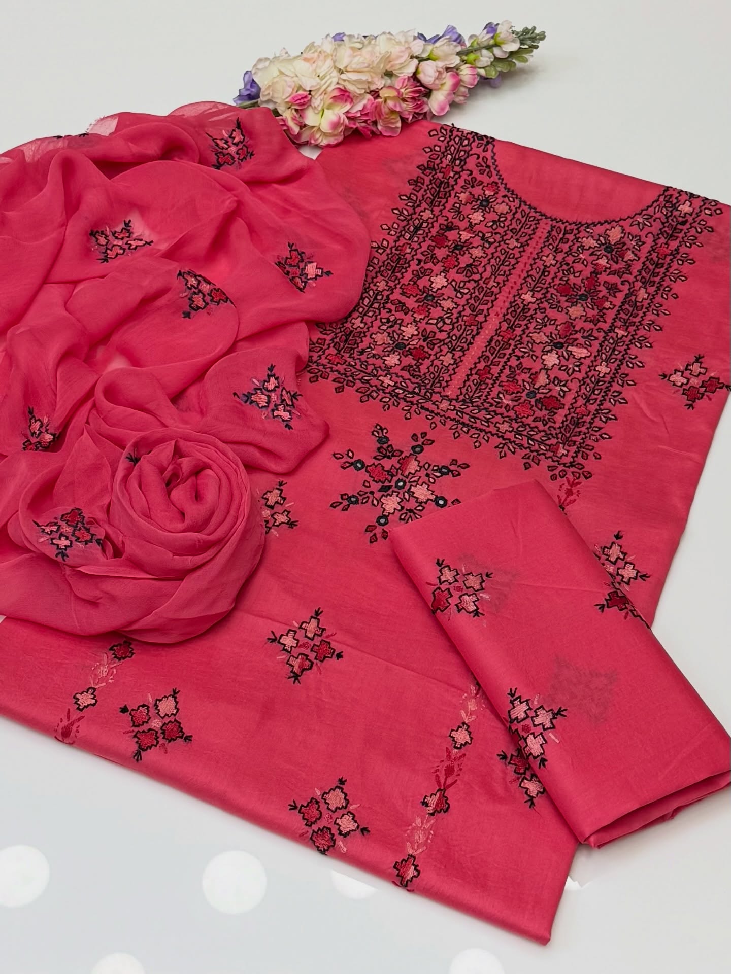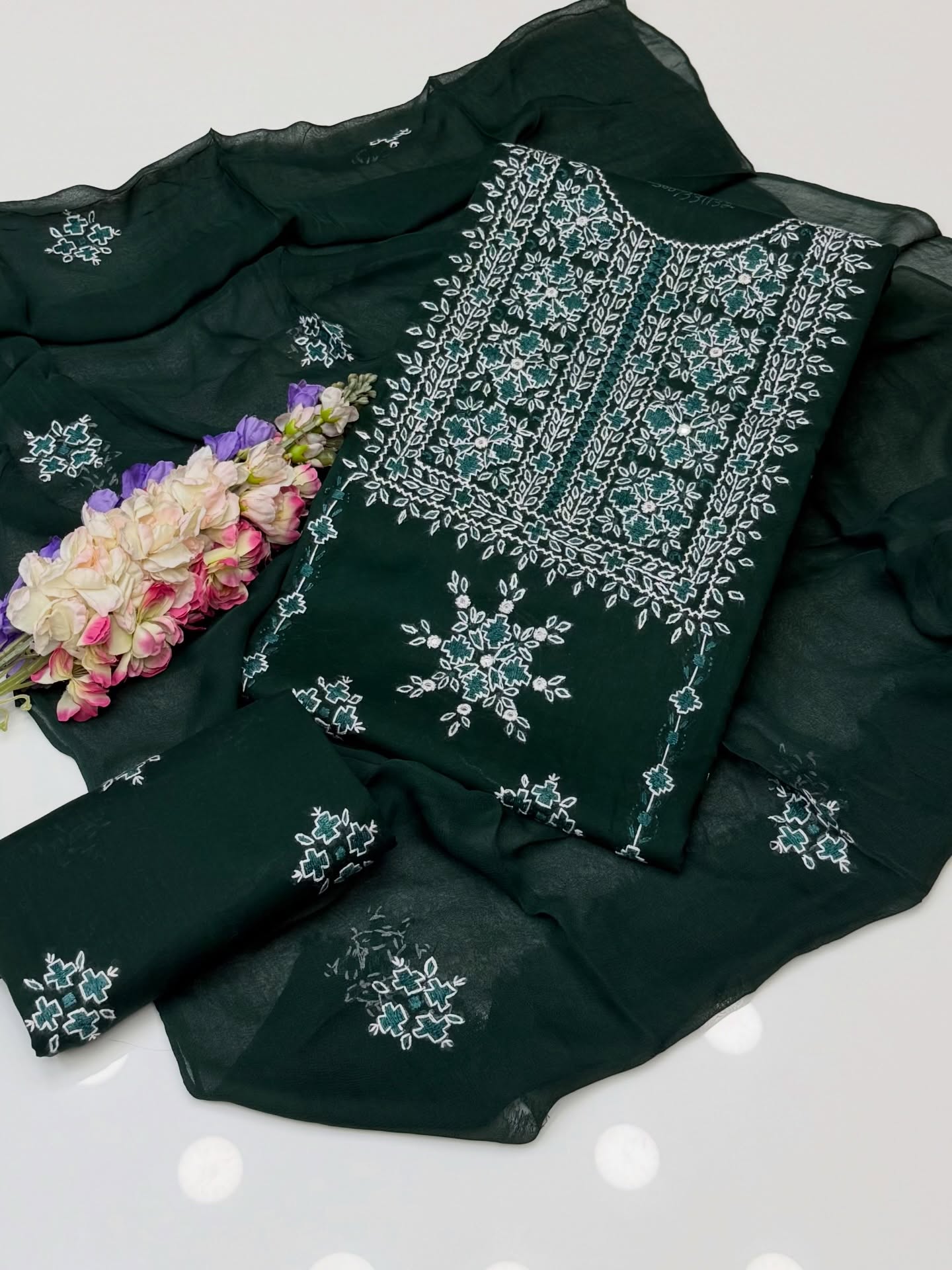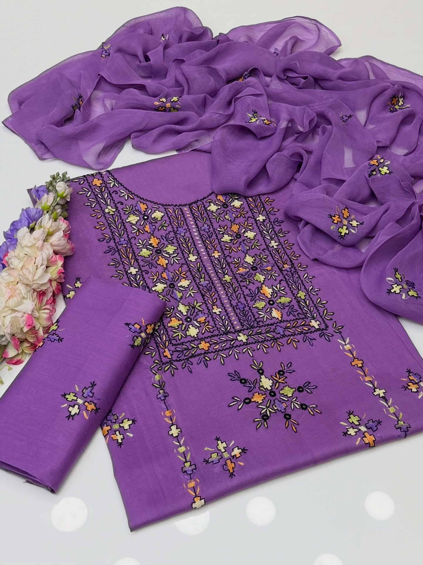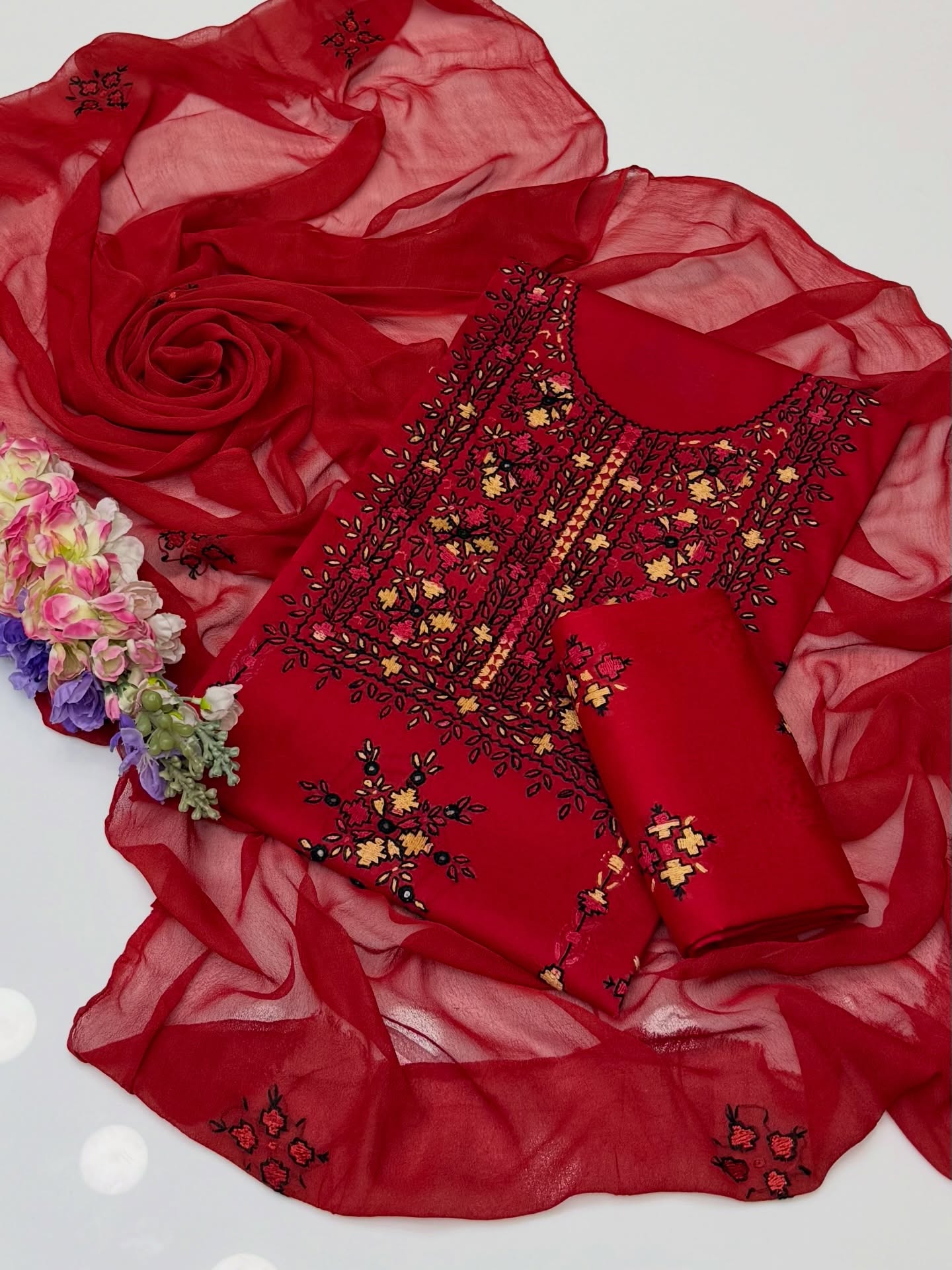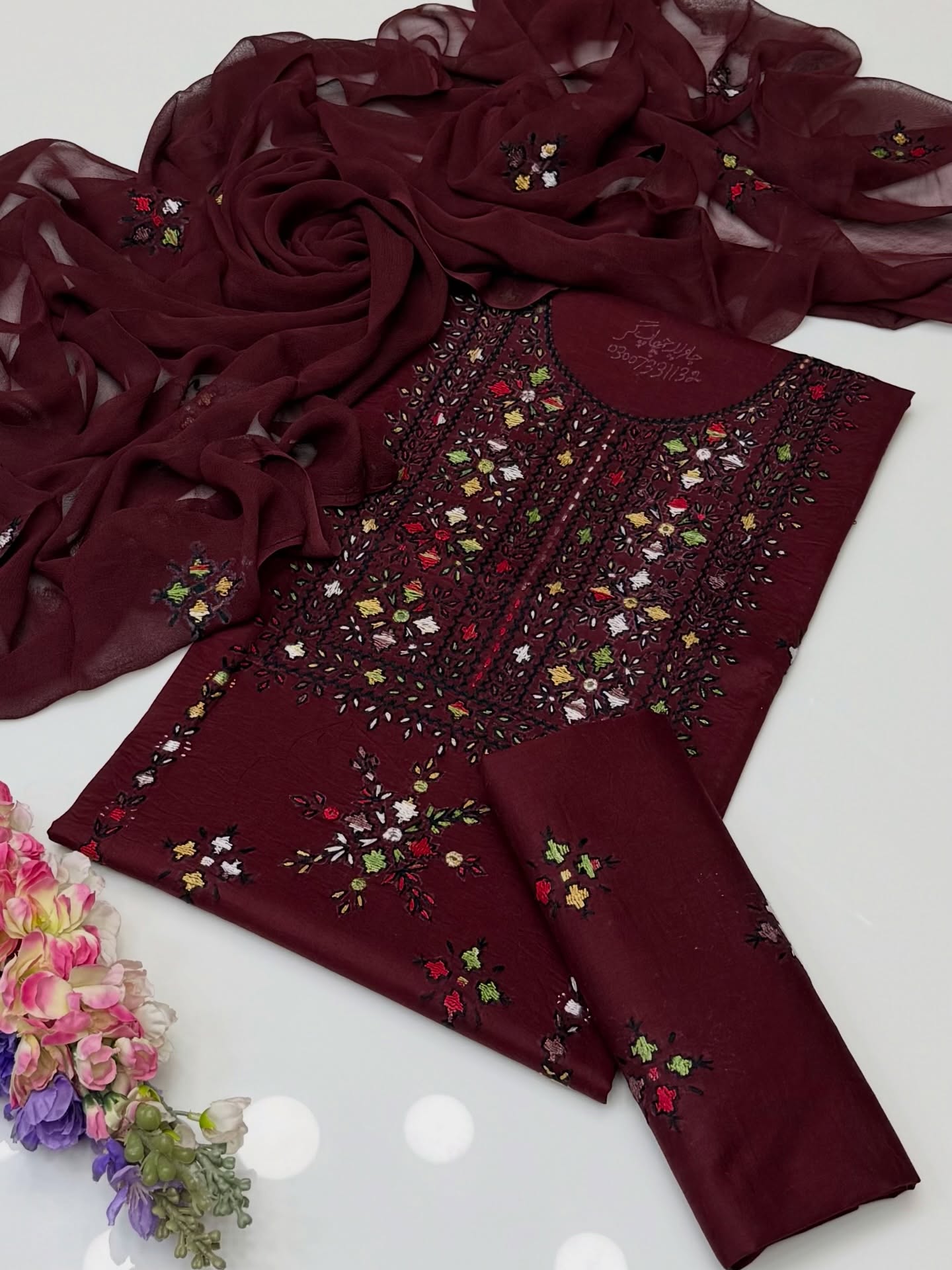With Sheesha Work Pure Lawn Shirt And Trouser Along With Chiffion Embroidered Duppata 3 Pc Dress