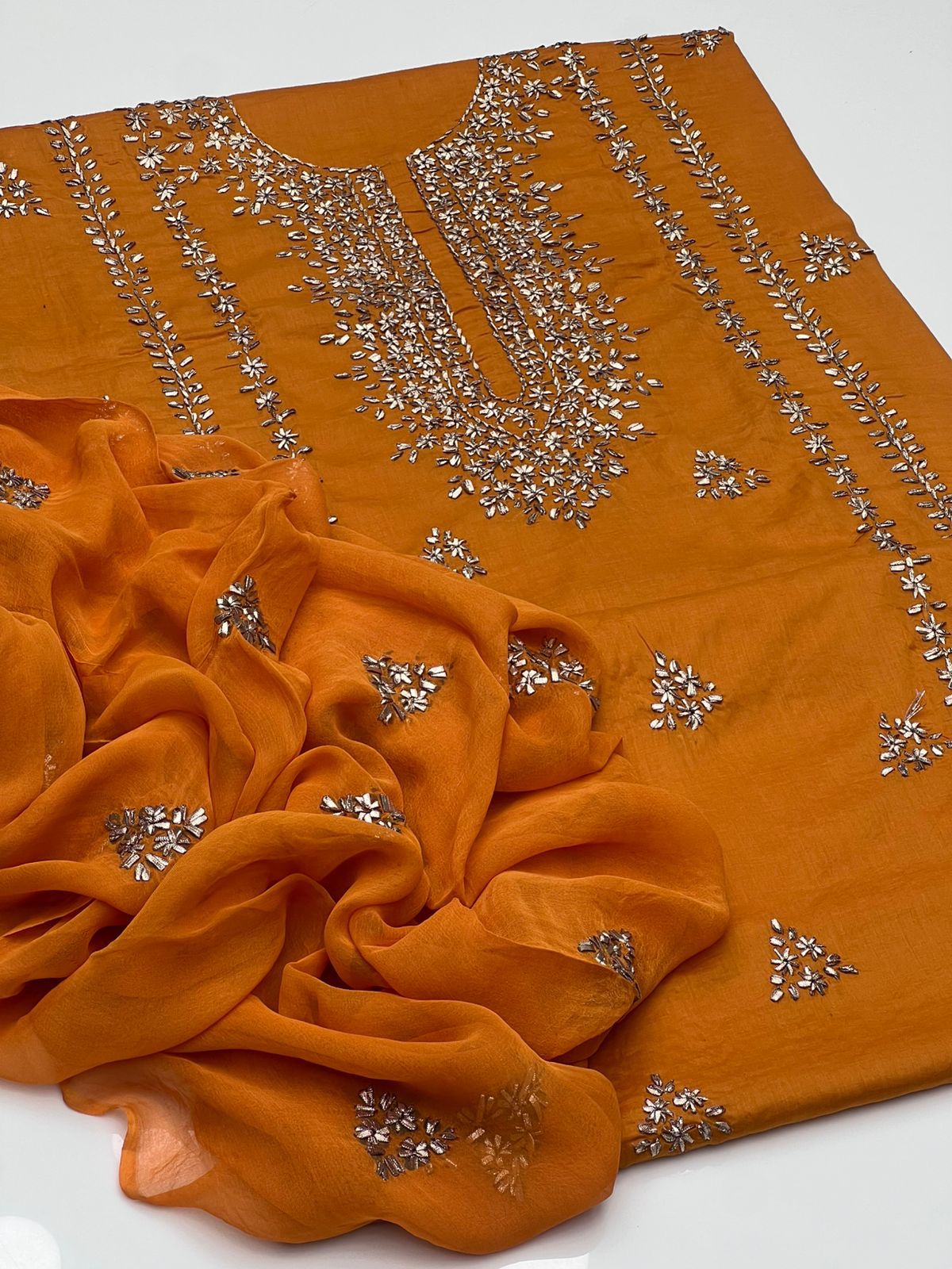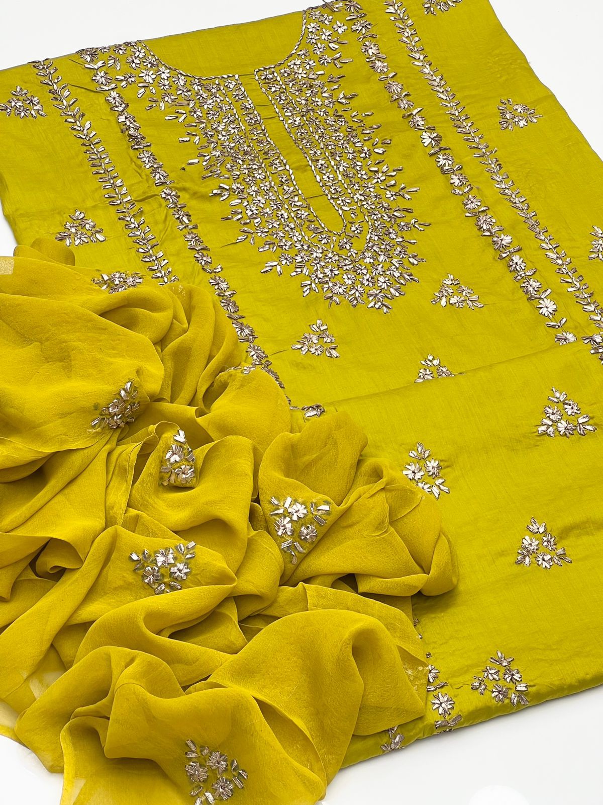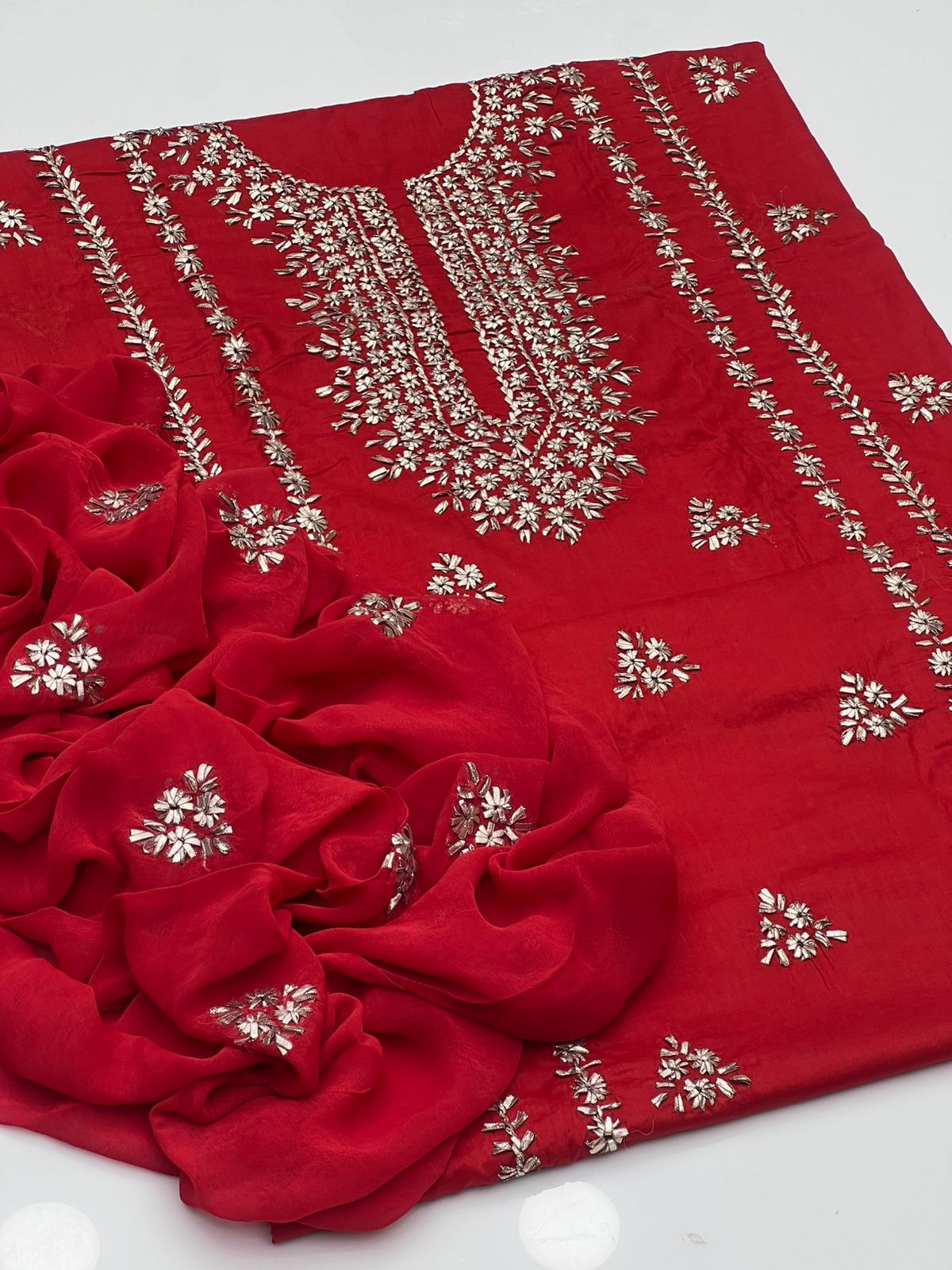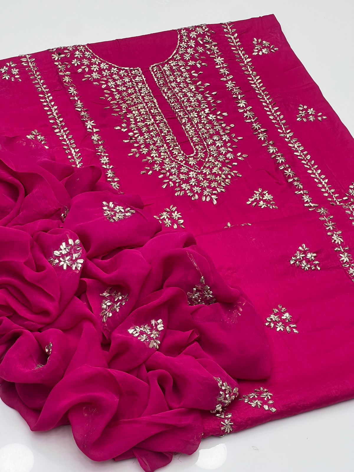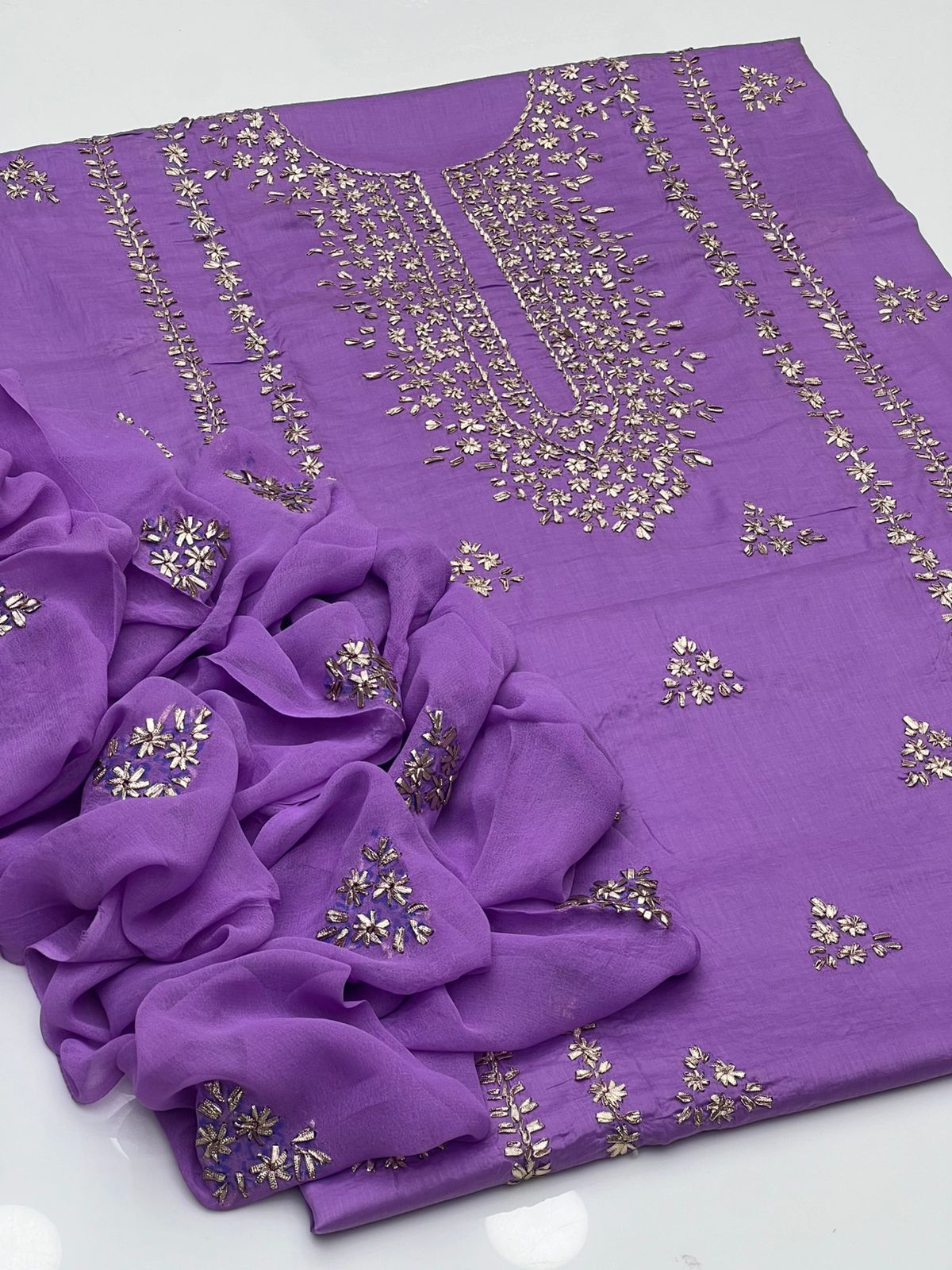 Handmade Lcd Gotta Work On Pure Gtm Lawn Kurta Style Shirt With Booti Work Shifoon Dupatta Along Plain Trouser 3pc Suit👗