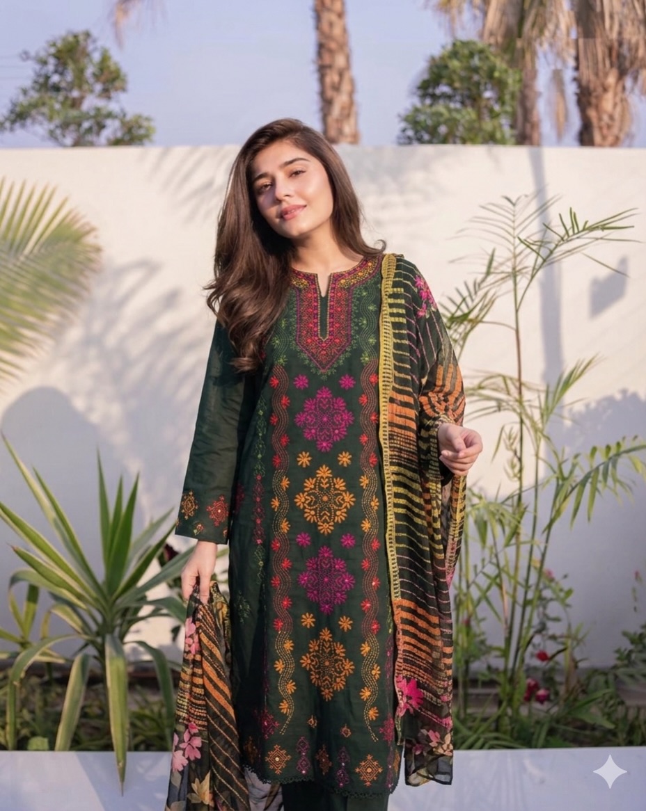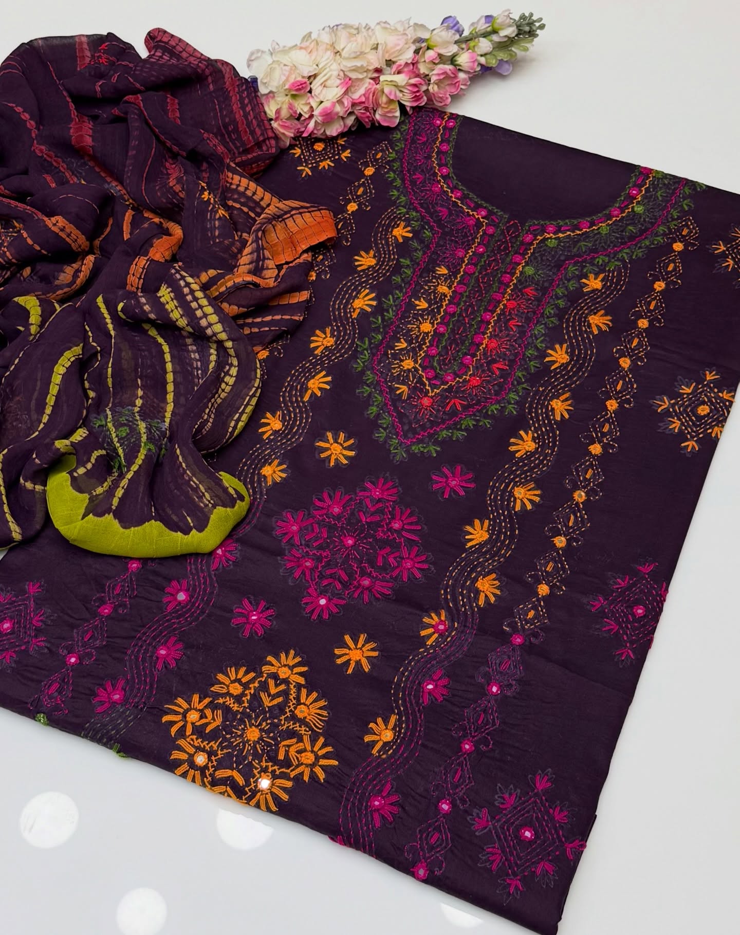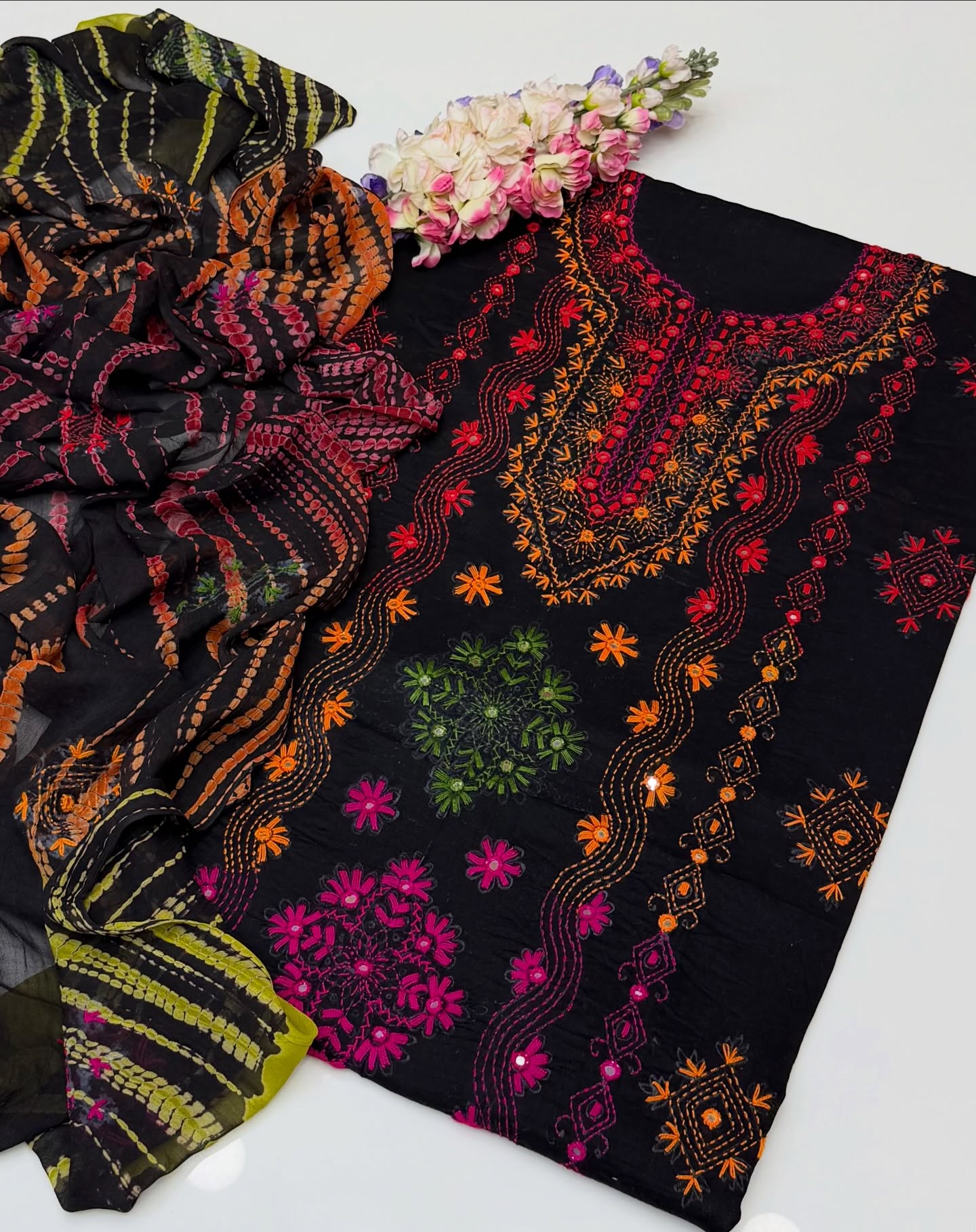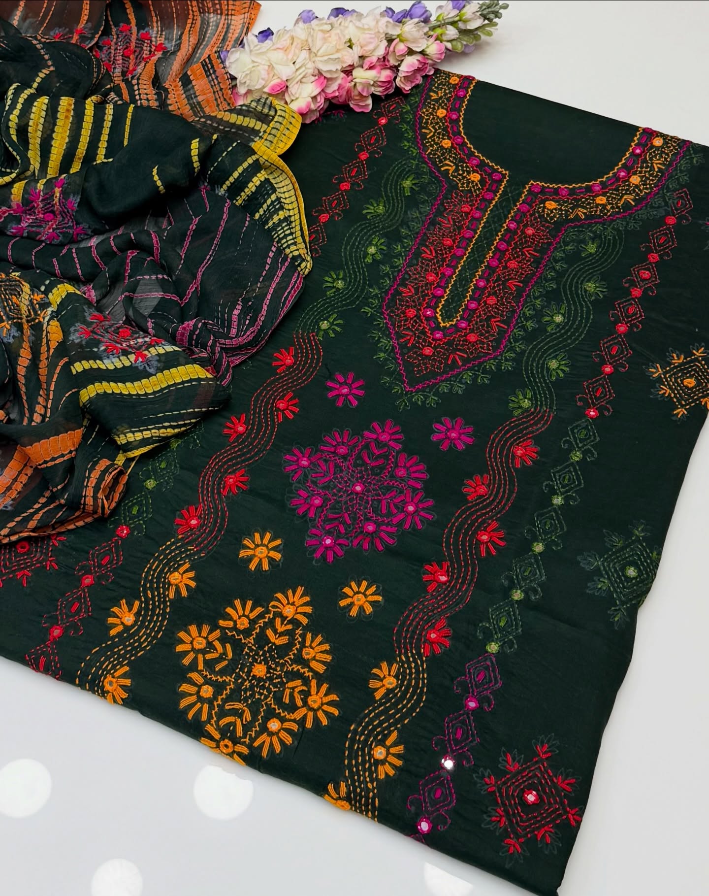 Eid Outfit Stuff lawn mirror afghani tanka neck daman bail embroidered shirt ,chiffon embroidered tye n dye dupatta and plain lawn trowser(attach with shirt back) 3pc dress