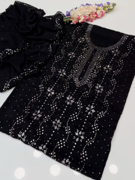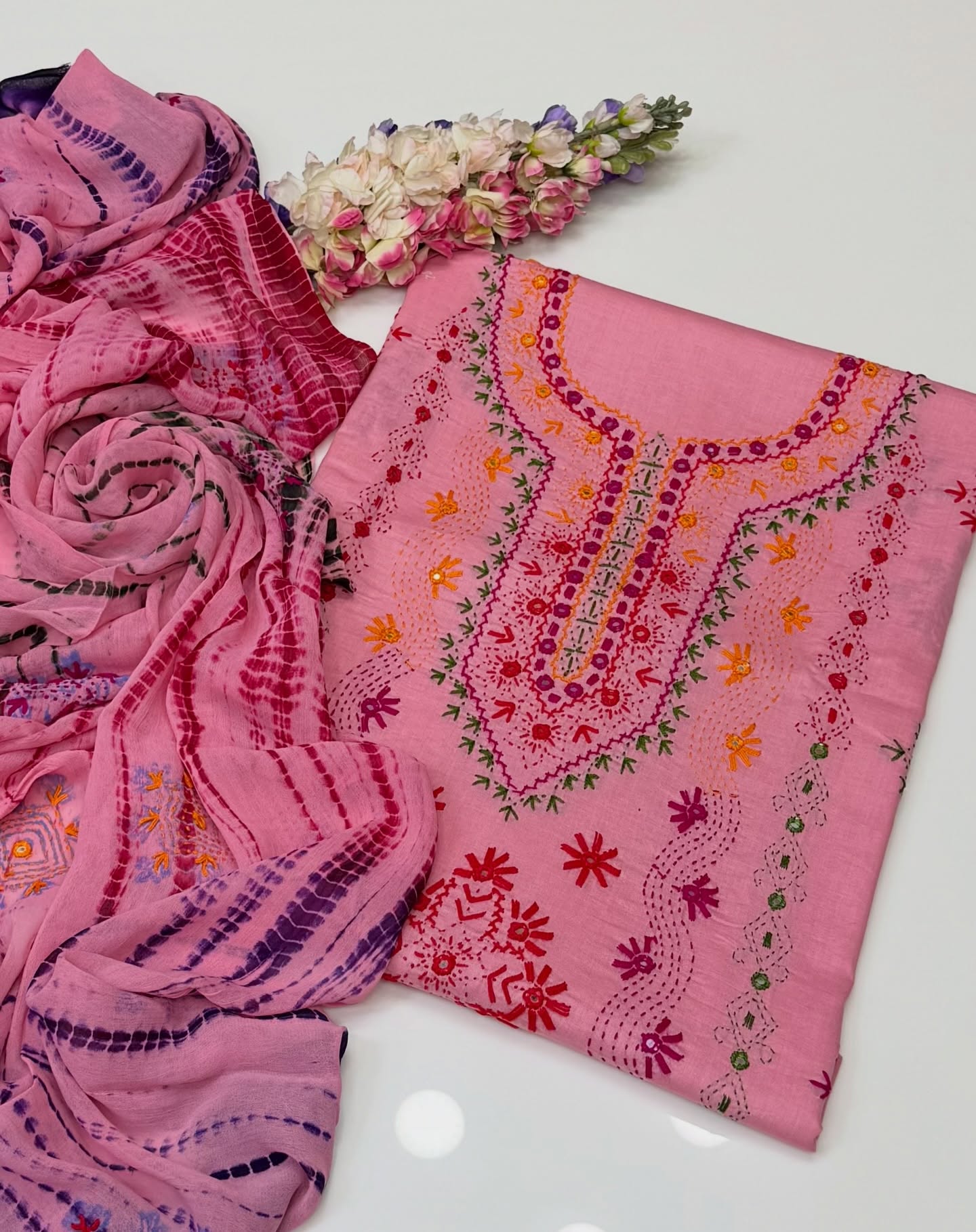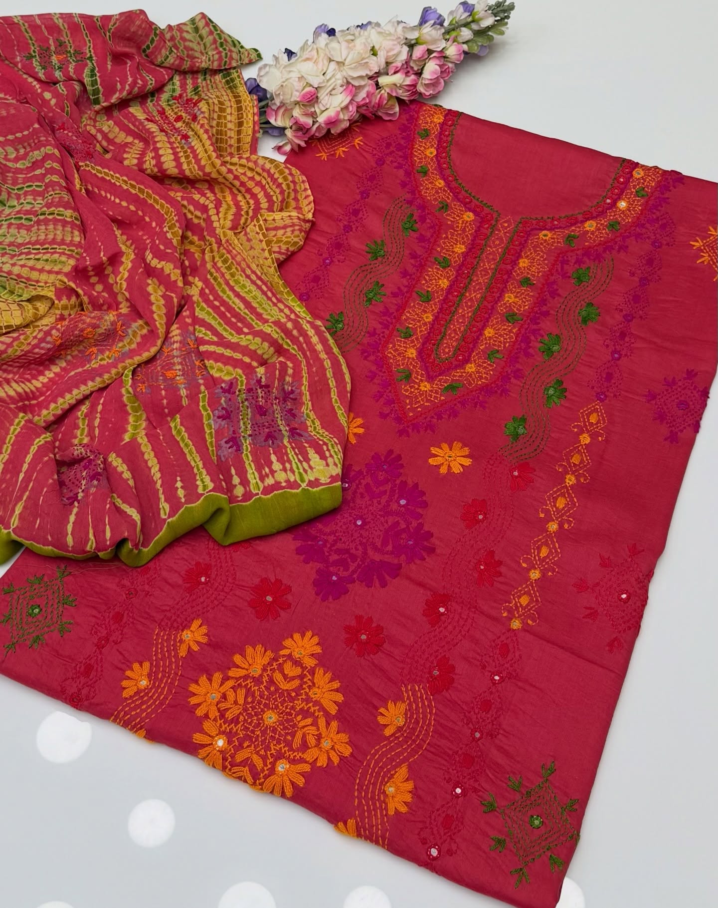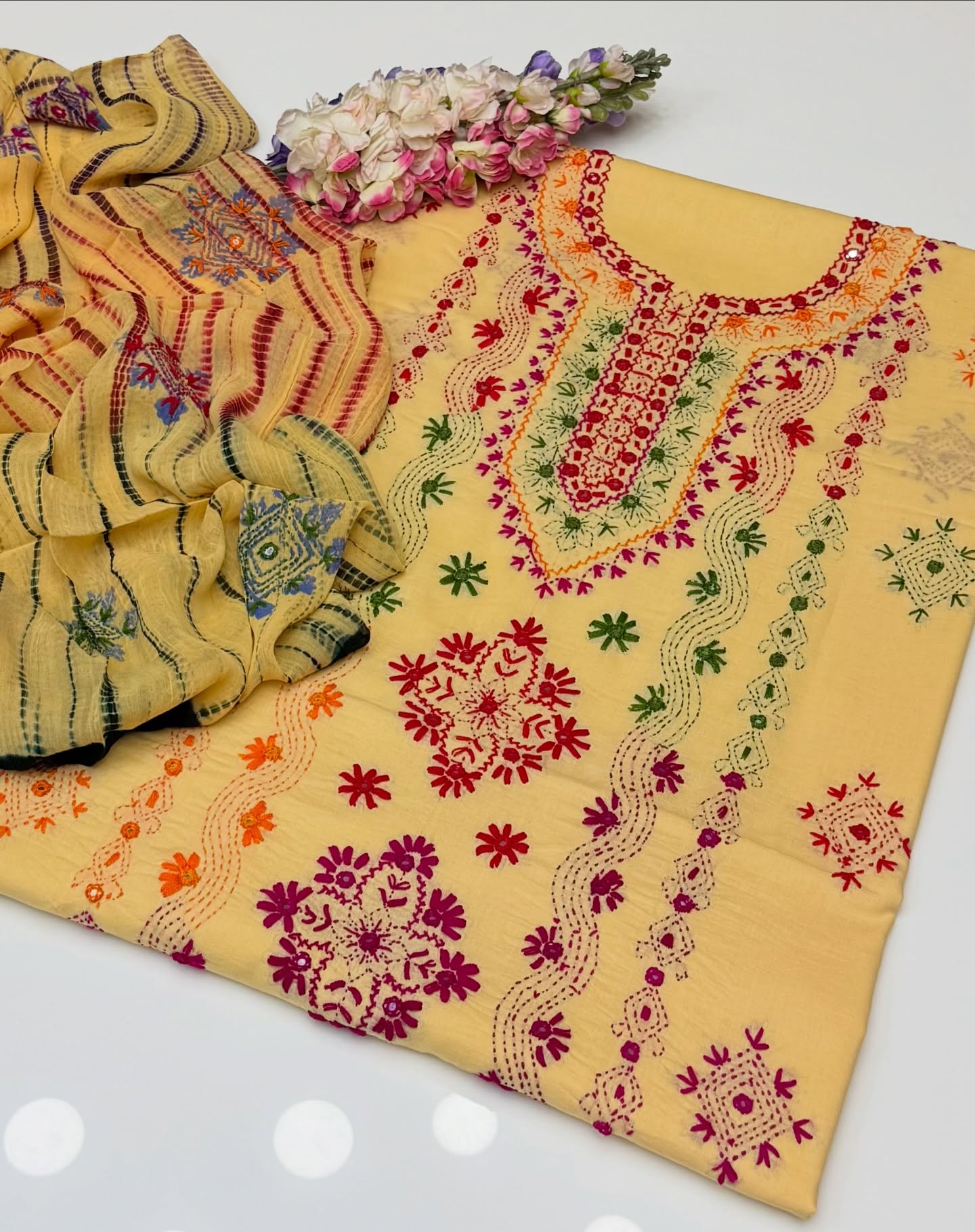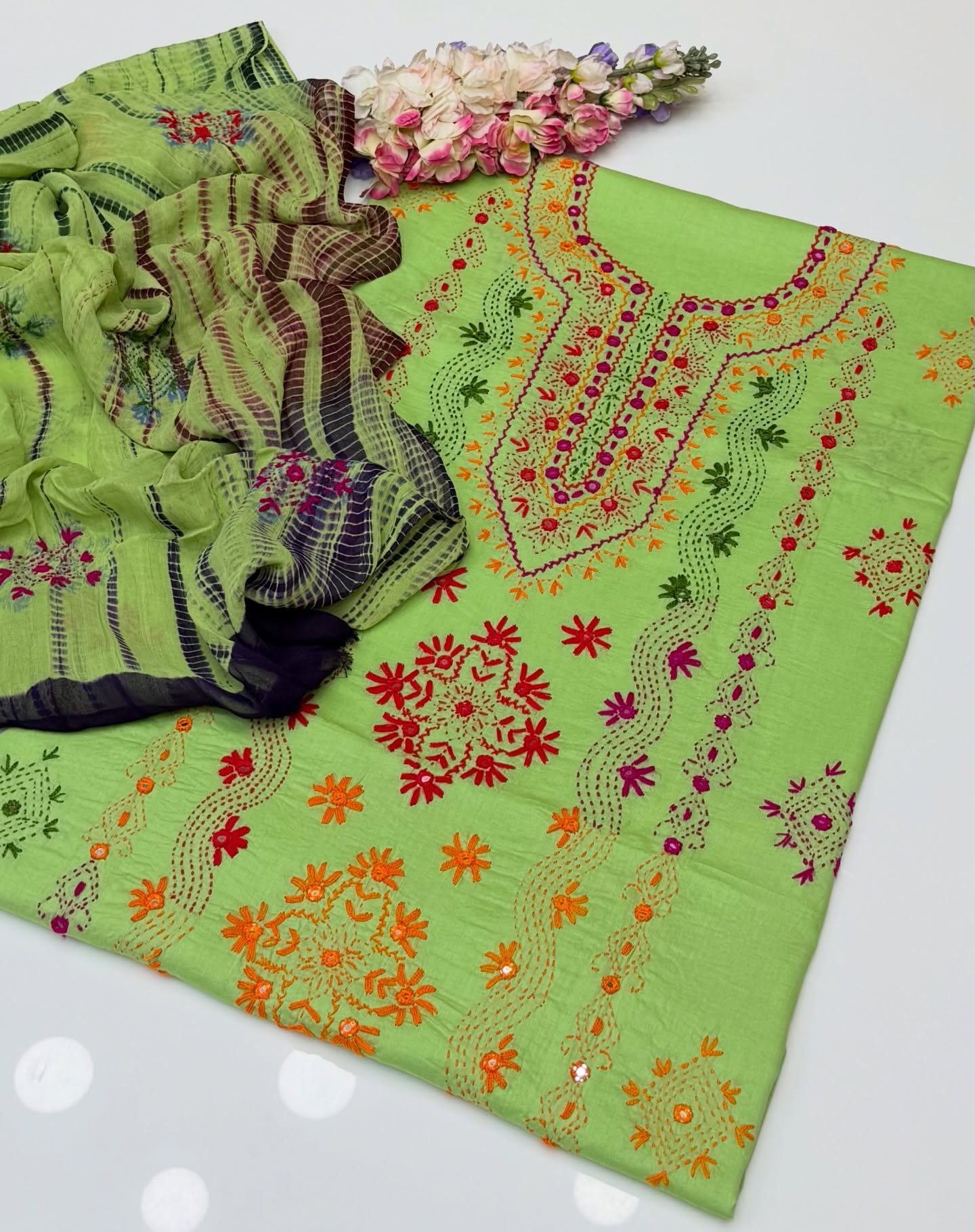 Eid Outfit Stuff lawn mirror afghani tanka neck daman bail embroidered shirt ,chiffon embroidered tye n dye dupatta and plain lawn trowser(attach with shirt back) 3pc dress