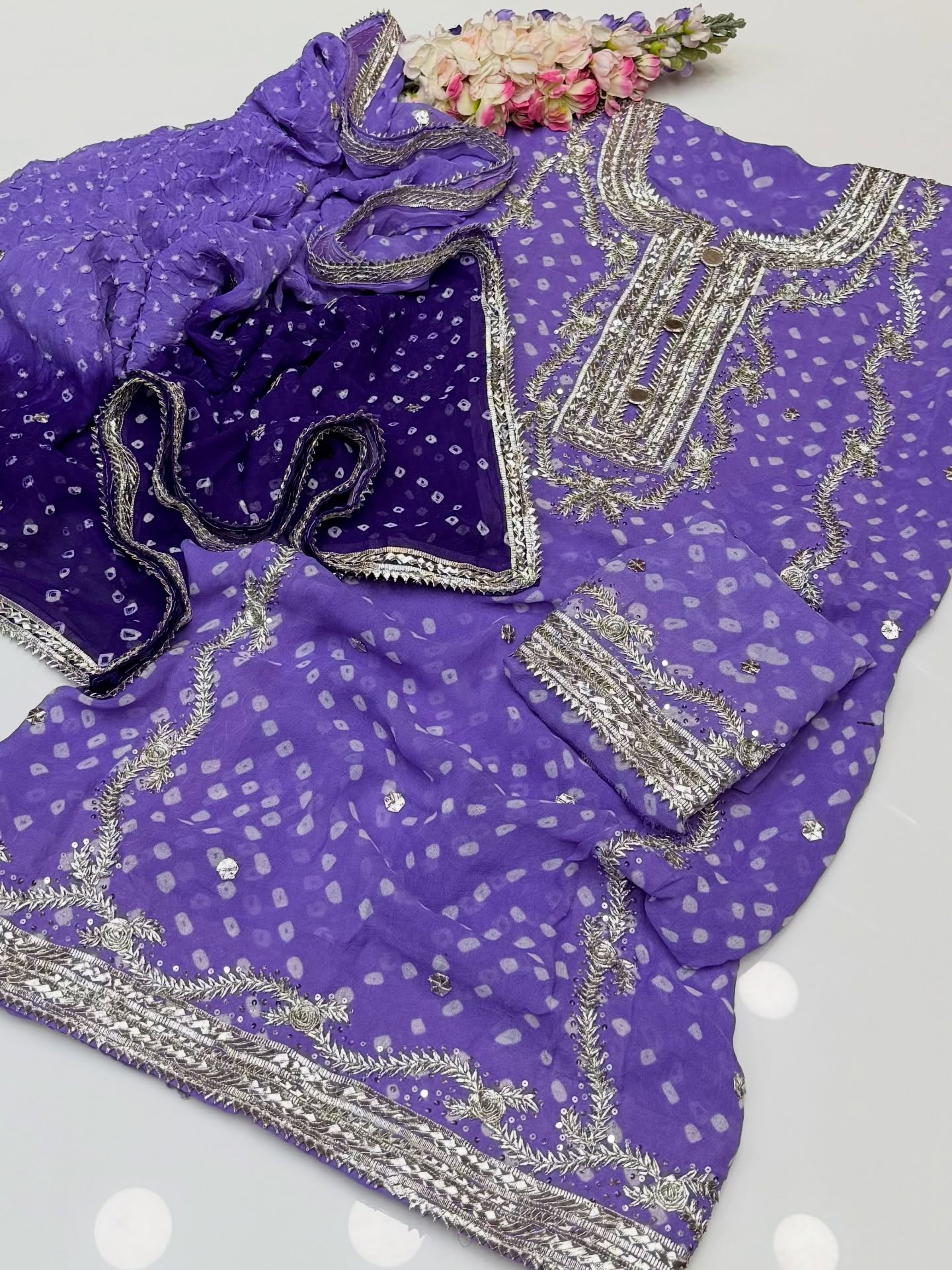 Handmade Shafon Chunri Marrori Flower 🌺 Gotta Shirt back Kurta Style. Seprate Bazo. With Heavy Border. With 2 shade Shafon Chunri Dupatta 2 pc Dress 👗
