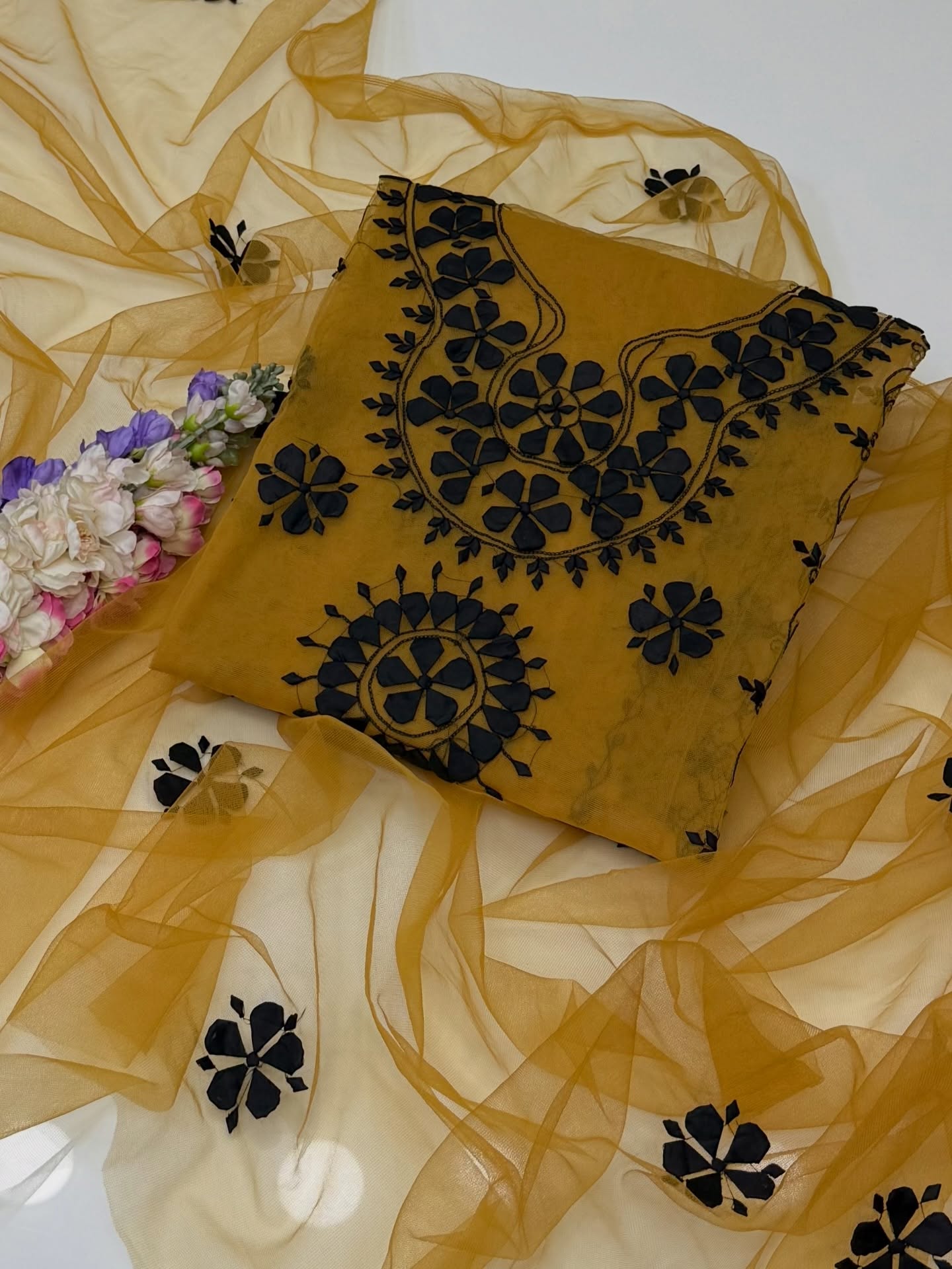 Handmade Applic Work On Net Fabric Full Shirt Jall With Booti Jall Dupatta 2pc Suit