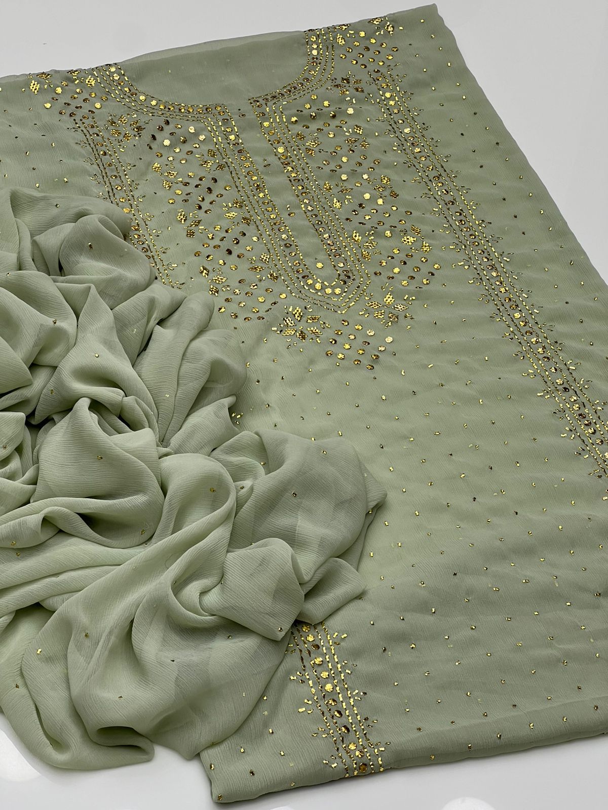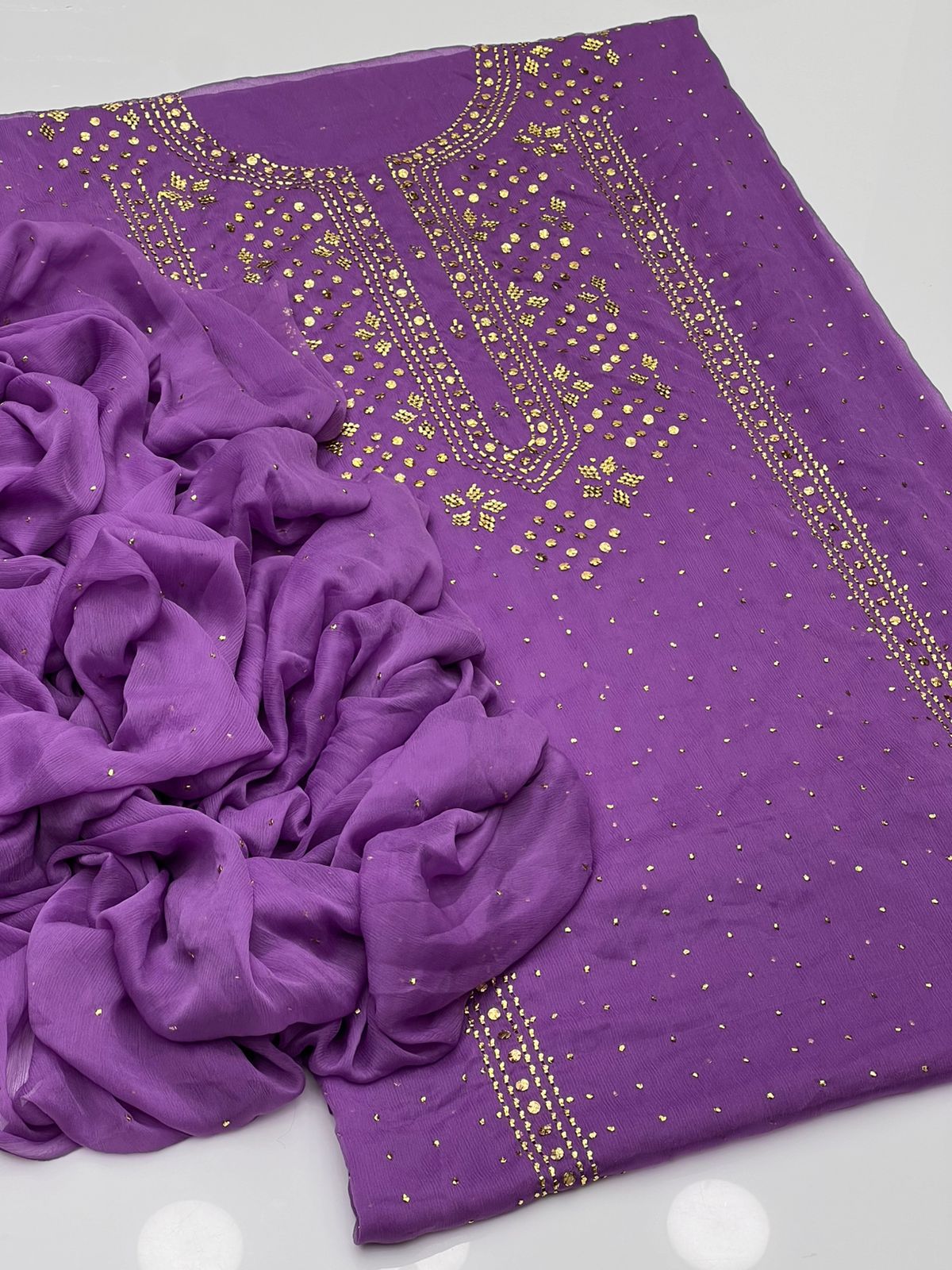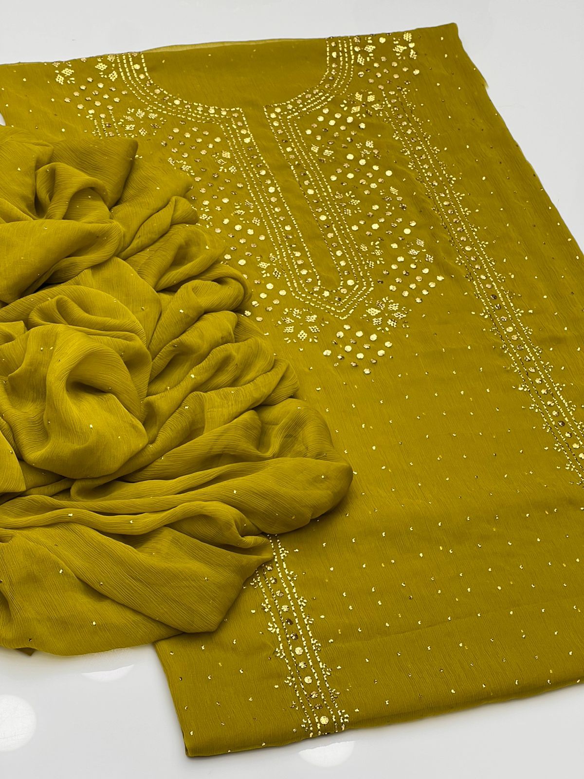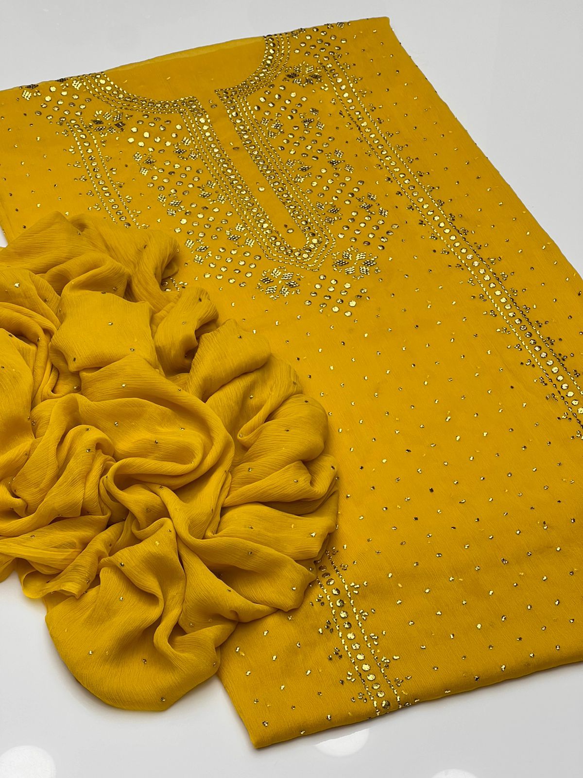 Beautiful Golden Mukesh Kamdani Work Soft Bamber Chiffion Shirt With Mukesh Chiffion Duppata 2 Pc 👗