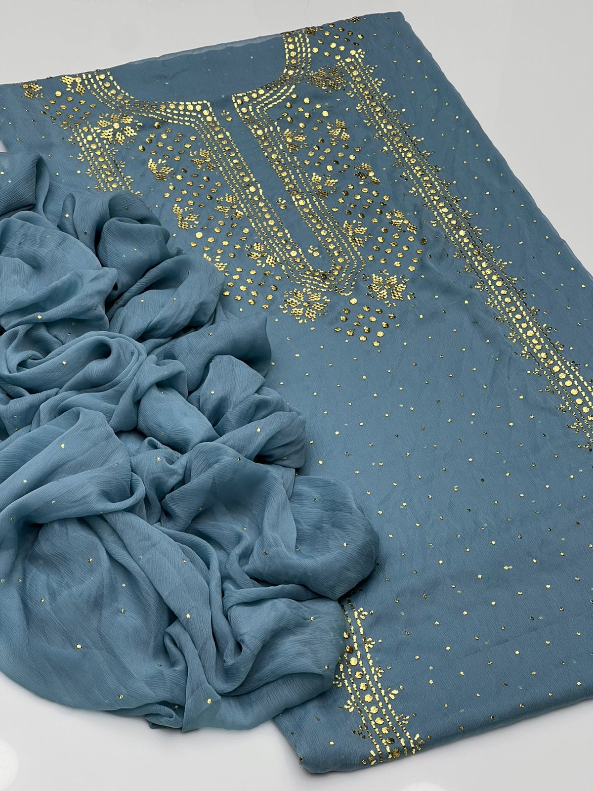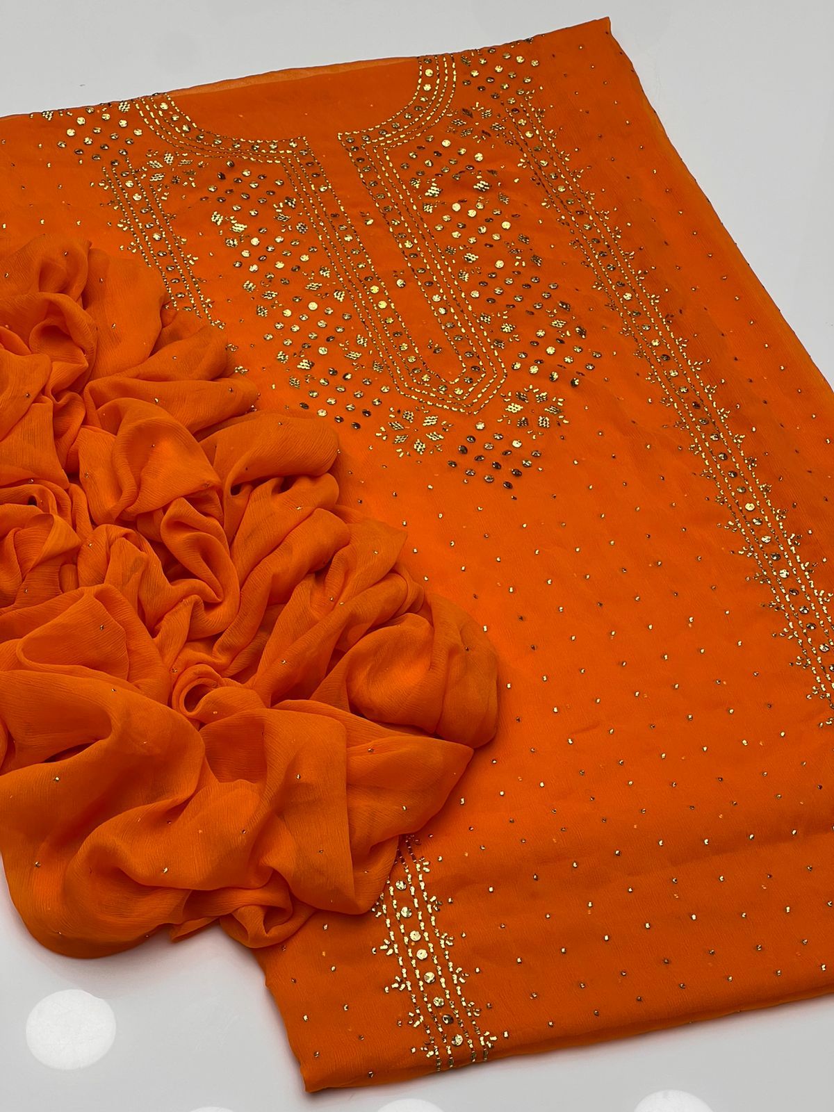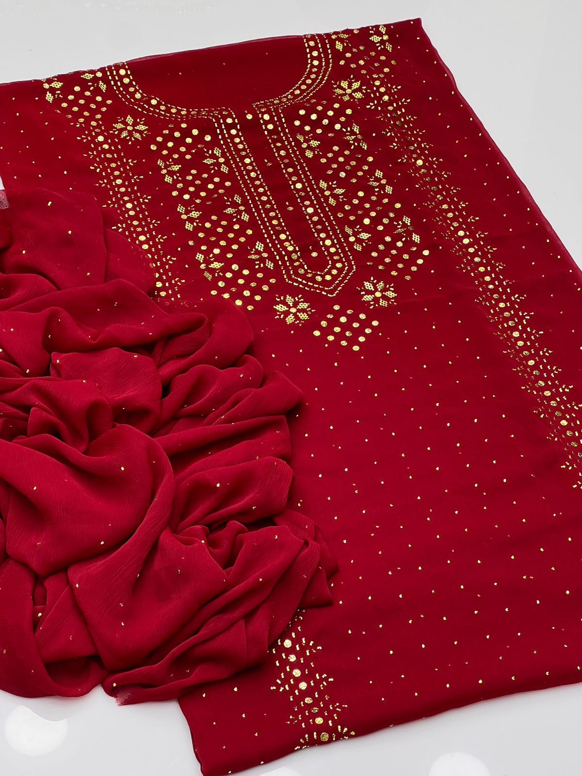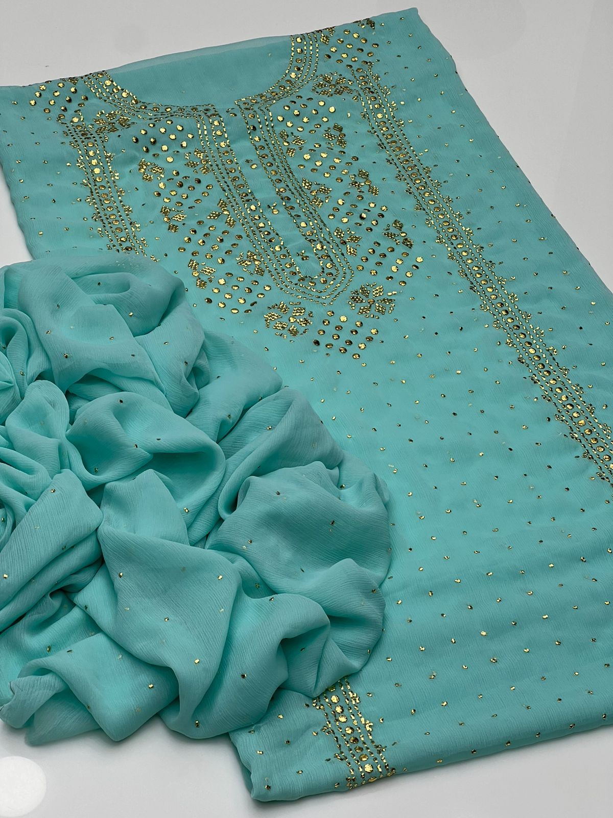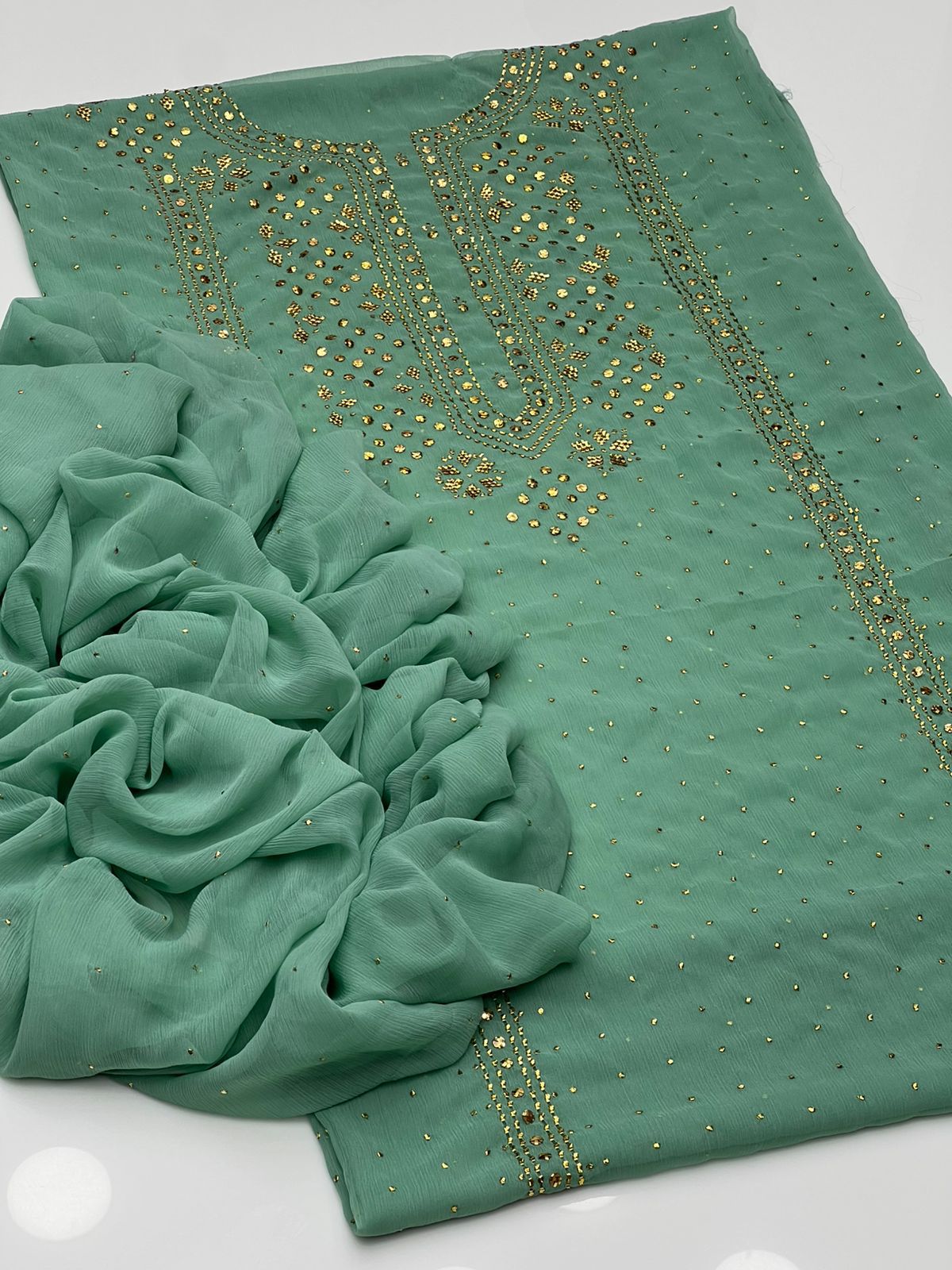 Beautiful Golden Mukesh Kamdani Work Soft Bamber Chiffion Shirt With Mukesh Chiffion Duppata 2 Pc 👗