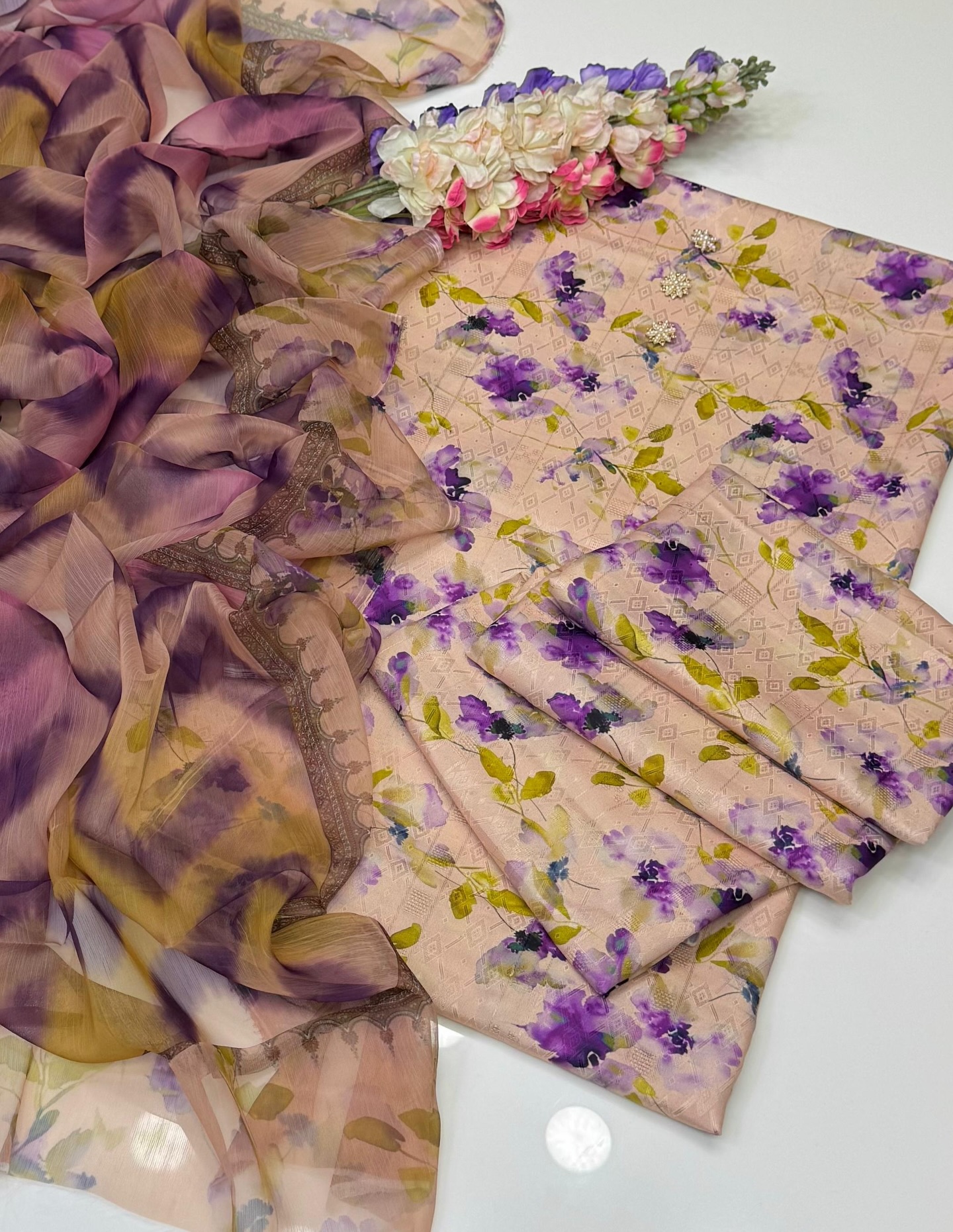 – Premium quality *SELF* swiss jacquard lawn fabric digital printed shirt Premium quality *SELf* Swiss *JACQUARD* lawn fabric digital printed trouser chiffon digital printed dupatta 3pc unstitched suit 👗